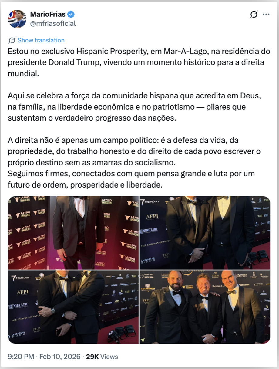 Em publicação em seu perfil no X, Frias classificou o encontro como um “momento histórico para a direita mundial”. Segundo ele, o evento celebrou a força da comunidade hispânica que compartilha valores como “Deus, a família, a liberdade econômica e o patriotismo”, que, segundo afirmou, sustentam o “verdadeiro progresso das nações”.
