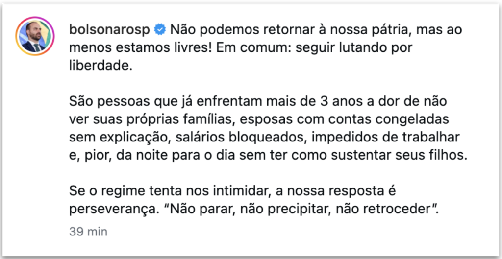 Na legenda da imagem, o filho do ex-presidente Jair Bolsonaro (PL) escreveu: “não podemos retornar à nossa pátria, mas ao menos estamos livres!”. Eduardo disse que são pessoas que enfrentam dificuldades há mais de 3 anos, incluindo separação de familiares, congelamento de contas bancárias sem justificativa e impedimentos para trabalhar.
