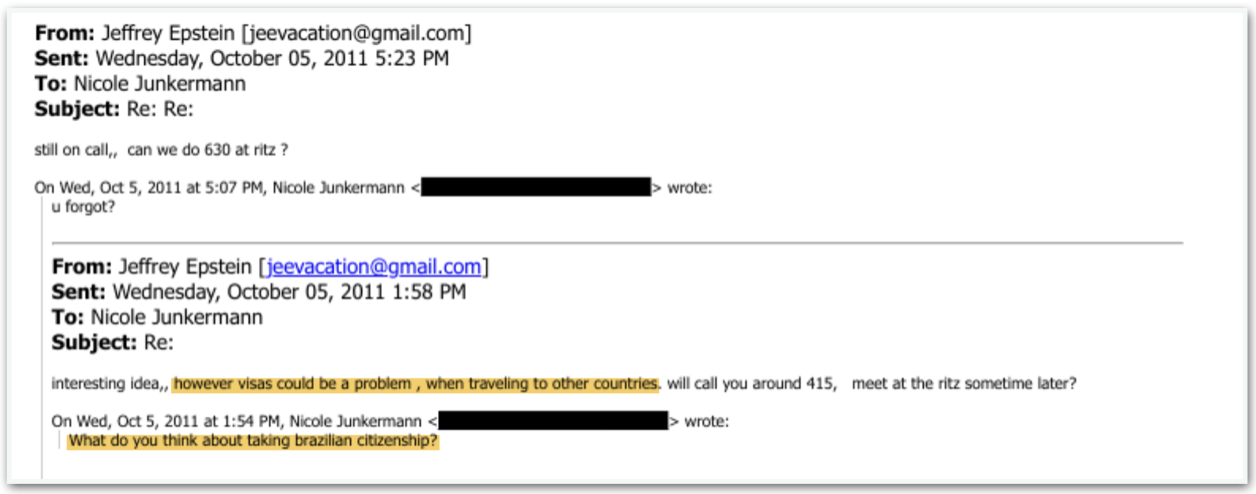 Documentos do Departamento de Justiça americano mostram que Epstein também considerou obter cidadania brasileira. Em 5 de outubro de 2011, a empresária Nicole Junkermann questionou o magnata sobre o assunto. Esta conversa sobre cidadania brasileira se deu cerca de 8 anos após a inscrição do CPF de Epstein no Brasil.