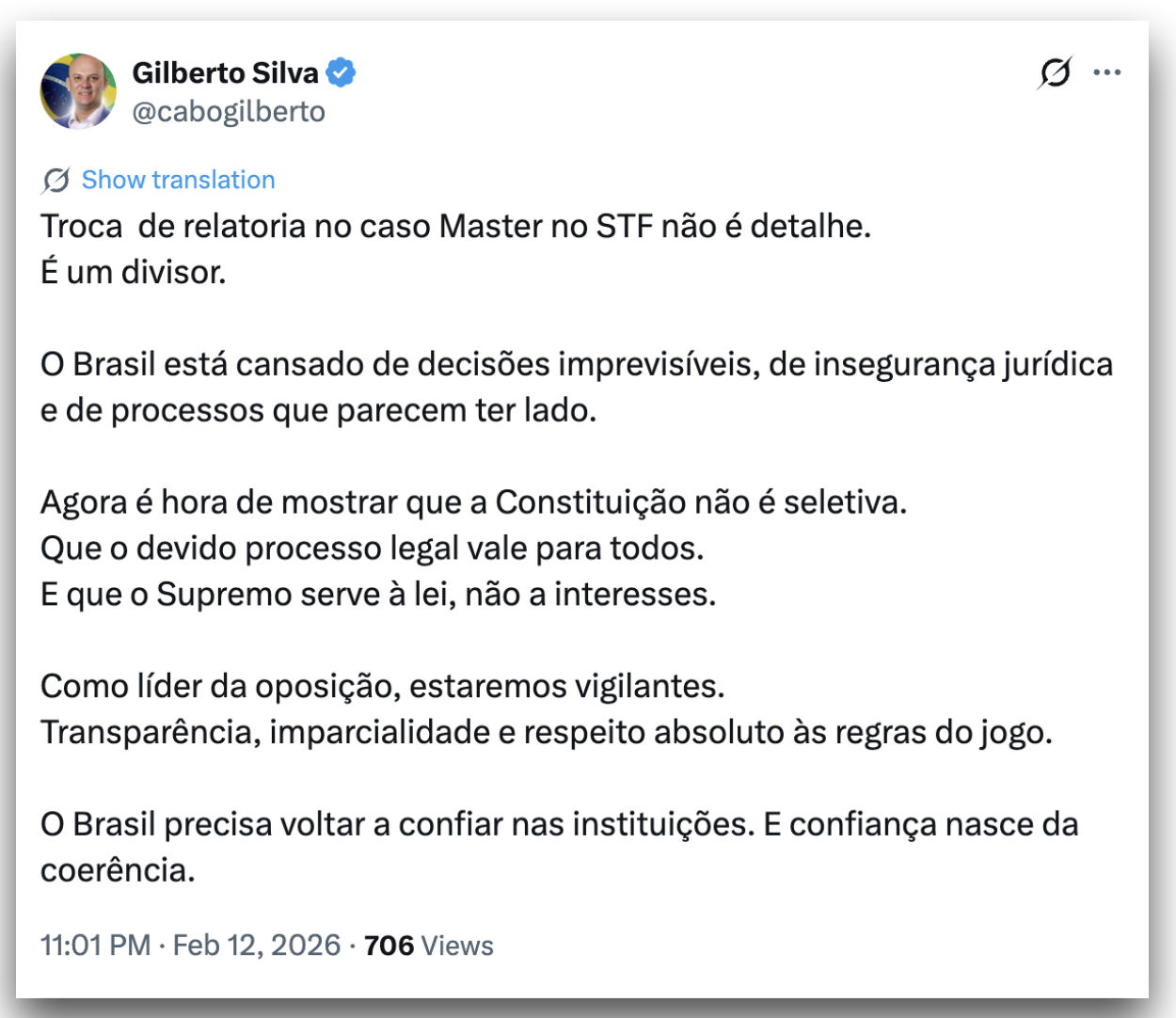O líder do PL na Câmara, deputado Sóstenes Cavalcanti (RJ), classificou a mudança como positiva para o país. Segundo ele, o caso passa a ter a chance de ser conduzido com rigor jurídico, previsibilidade e respeito à Constituição, o que, na avaliação do congressista, é essencial para a segurança jurídica.