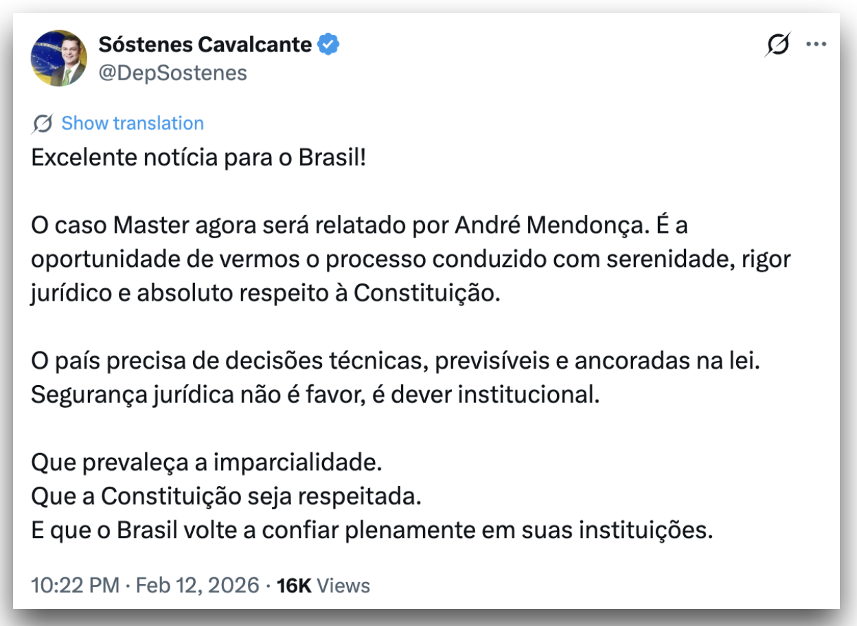 Congressistas da oposição ao governo Luiz Inácio Lula da Silva (PT) celebraram a substituição do ministro Dias Toffoli pelo ministro André Mendonça na relatoria do caso Master no STF (Supremo Tribunal Federal). A mudança foi feita na 5ª feira (12.fev.2026), por sorteio, depois de revelações sobre o relacionamento de Toffoli com Daniel Vorcaro, controlador do banco.