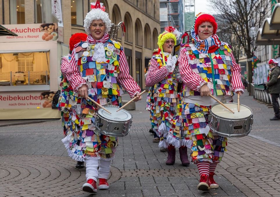 Os “Jecken” partem de quatro praças em direção ao Alter Markt, onde às 18h00 começa um animado programa de Carnaval com muita música e o Triunvirato.