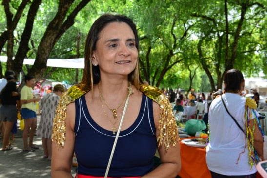 Paciente oncológica pela segunda vez, a servidora pública Elaine Rocha encontrou no empreendedorismo uma forma de enfrentar o tratamento contra o câncer de mama. Há quatro semanas, ela participa da Feira do Coreto, realizada aos sábados, onde vende salada de frutas para ocupar a mente e complementar a renda.