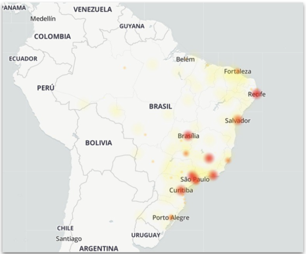 O mapa do site Downdetector mostra que as reclamações estão, em grande parte, concentradas nas capitais do Brasil, dada a maior concentração de habitantes nas regiões.