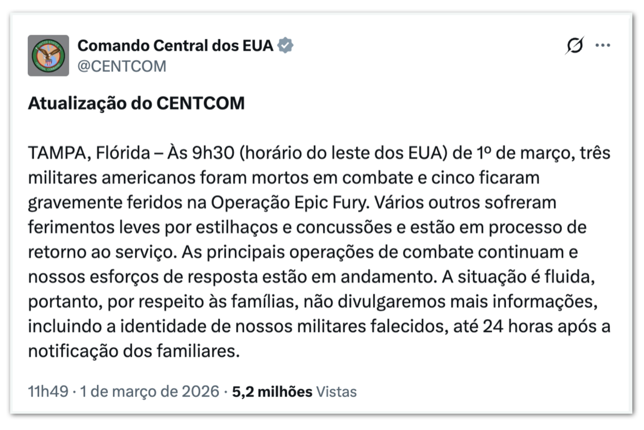 O Centcom (Comando Central dos Estados Unidos) informou neste domingo (01.mar.2026) a morte de 3 militares norte-americanos durante os ataques ao Irã. Outros 5 soldados sofreram ferimentos graves. As baixas são as primeiras registradas pelas forças dos EUA desde os bombardeios realizados no sábado (29.fev.2026) por Washington e Tel Aviv contra território iraniano. Os ataques resultaram na morte do aiatolá Ali Khamenei, líder supremo do país.