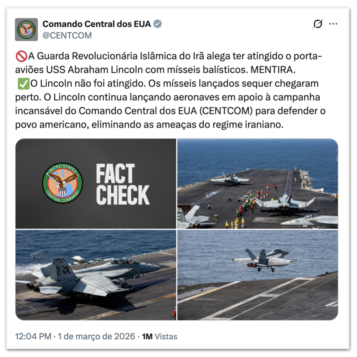 O Centcom também chamou de “mentira” a informação de que o porta-aviões USS Abraham Lincoln havia sido atingido por um ataque iraniano. “O Lincoln não foi atingido. Os mísseis lançados nem sequer se aproximaram”, afirmou o comando militar responsável pelas operações no Oriente Médio.
