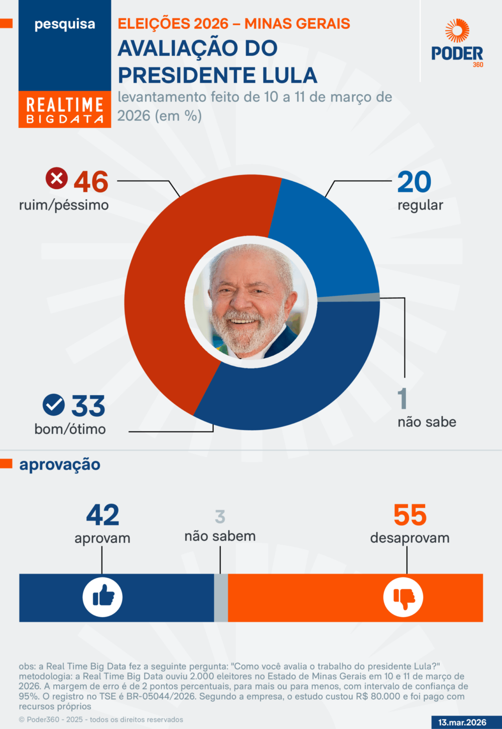 A pesquisa foi realizada pela Real Time Big Data de 10 a 11 de março de 2026. Foram entrevistadas 2.000 pessoas no Estado de Minas Gerais. O índice de confiança é de 95%. A margem de erro é de 2 pontos percentuais, para mais ou para menos. O levantamento está registrado no Tribunal Superior Eleitoral sob o código: BR-05044/2026.