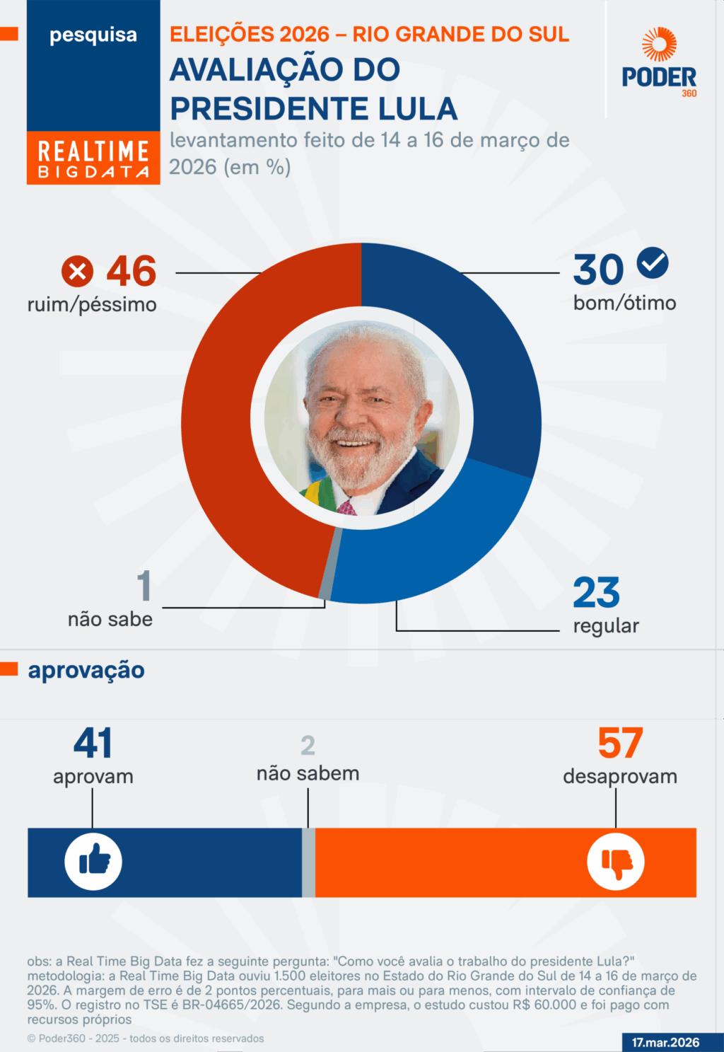 Levantamento Real Time Big Data divulgado nesta 3ª feira (17.mar.2026) mostra que o governo do presidente Luiz Inácio Lula da Silva (PT) é desaprovado por 57% dos eleitores no Rio Grande do Sul, enquanto 41% aprovam a gestão petista. Outros 2% não responderam ou não souberam dizer. Leia a íntegra da pesquisa (PDF – 2 MB).