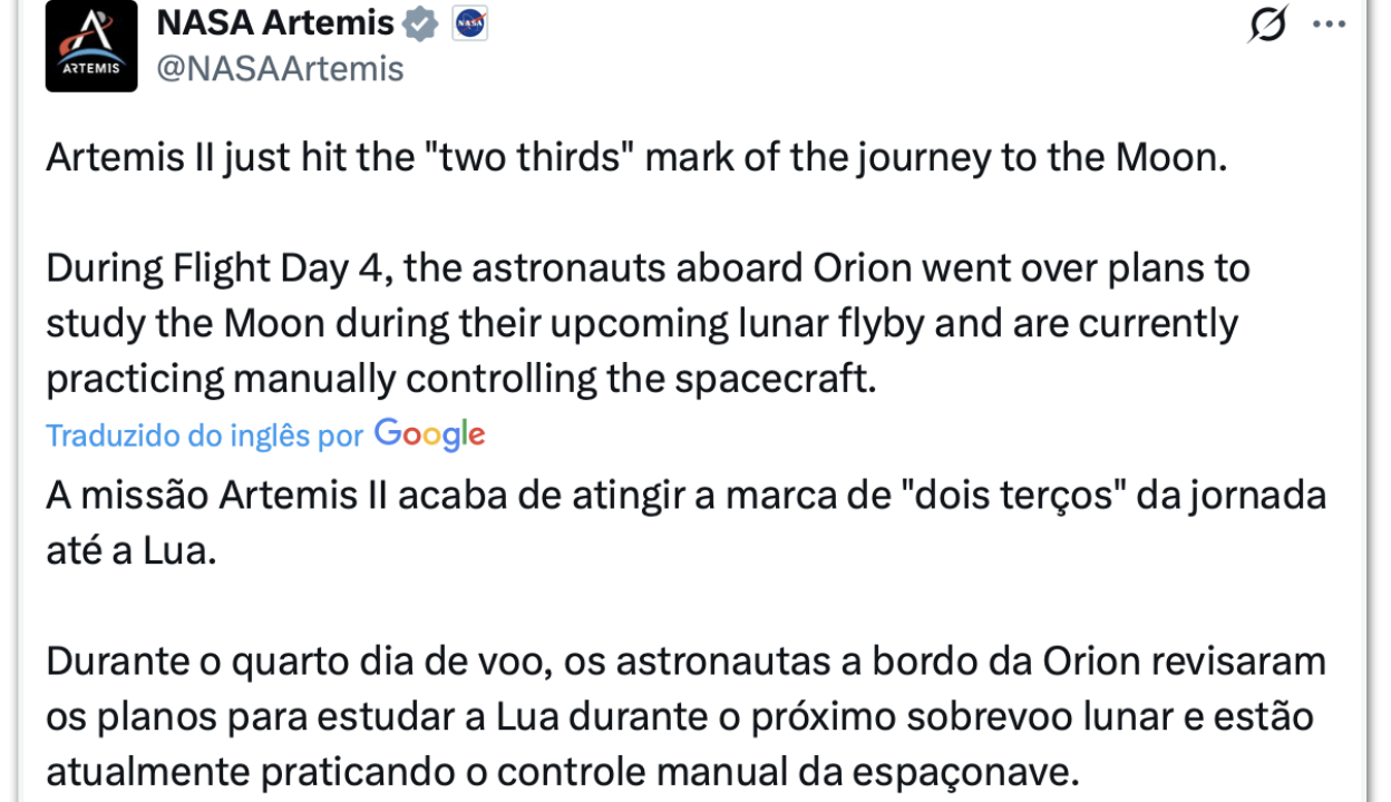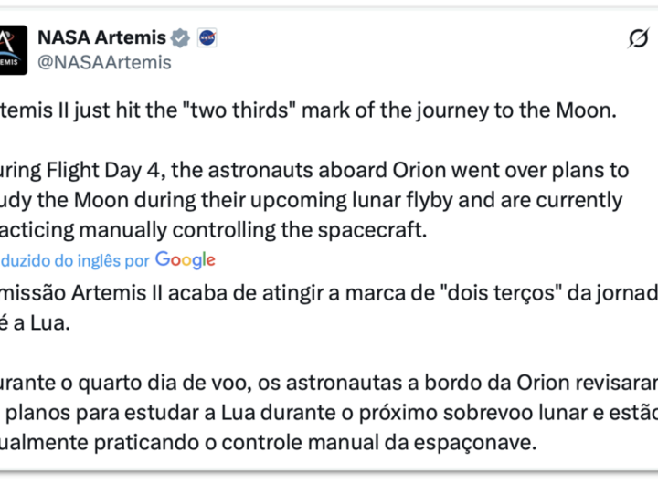 Artemis 2 chegará à Lua na tarde de 2ª feira 3 min read Geral Artemis 2 chegará à Lua na tarde de 2ª feira RealRadioTvBrasil abril 5, 2026