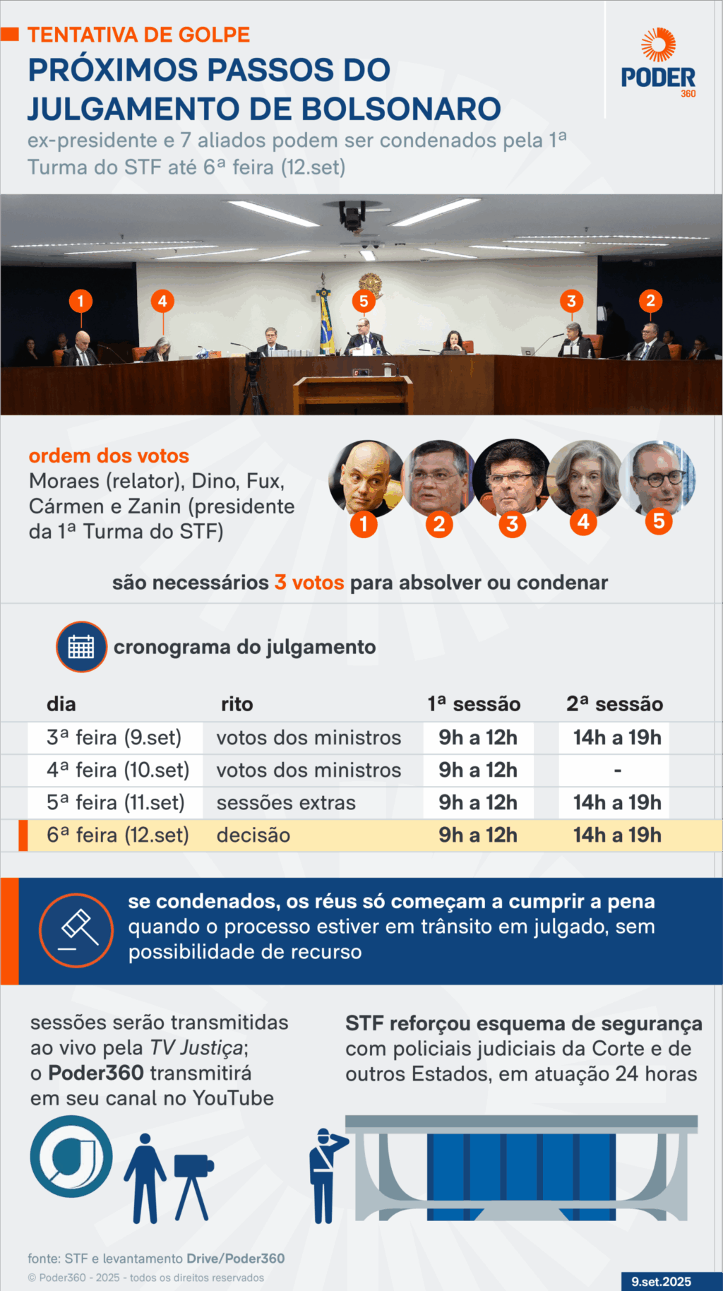 A 1ª Turma do STF julga o ex-presidente Jair Bolsonaro (PL) e mais 7 réus por tentativa de golpe de Estado. O Supremo já ouviu as sustentações orais das defesas de todos os réus. Agora, a análise será retomada com o voto do relator, ministro Alexandre de Moraes. A expectativa é que o processo seja concluído até 6ª feira (12.set), com a discussão sobre a dosimetria das penas.