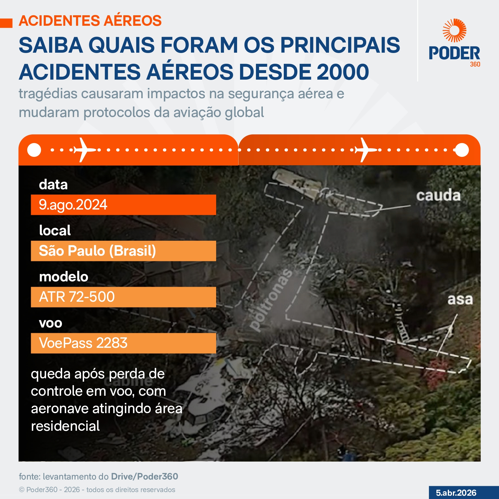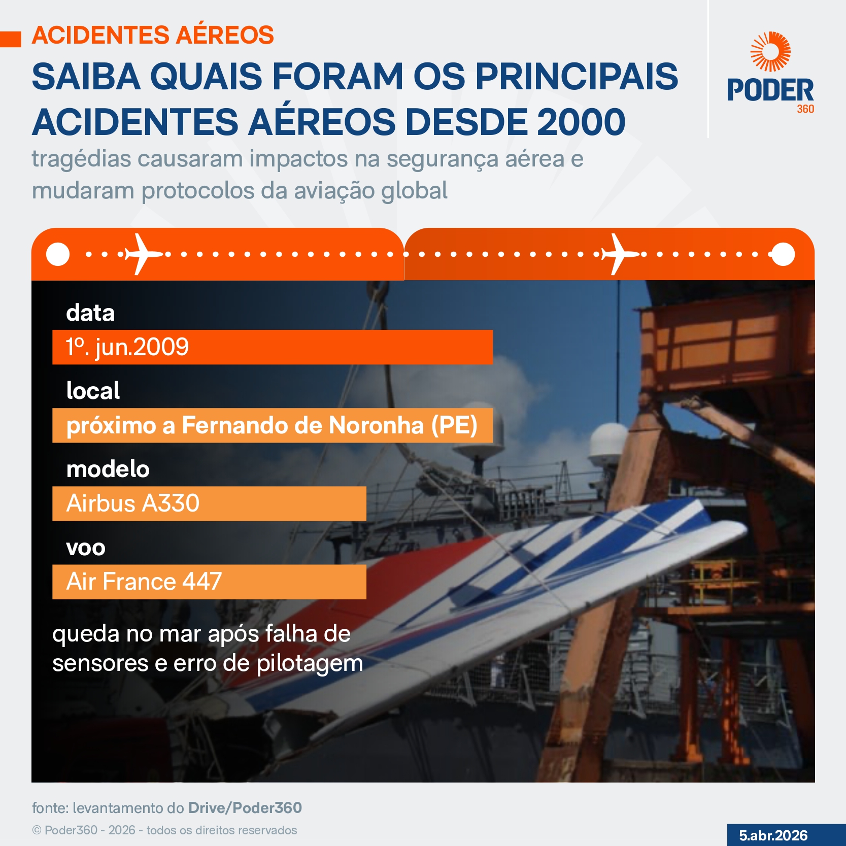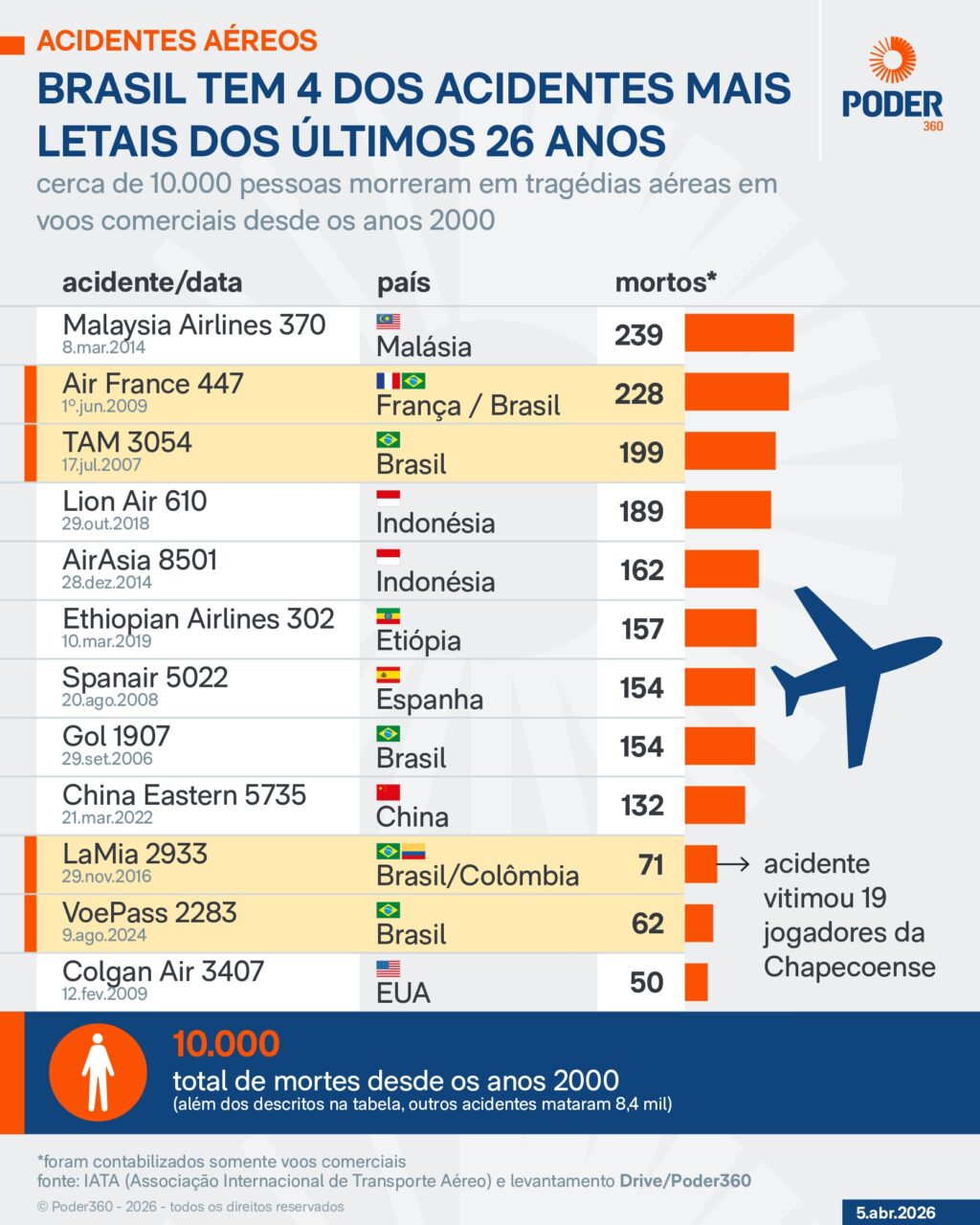 Desde o ano 2000, acidentes em voos comerciais provocaram aproximadamente 10.000 mortes no mundo, segundo levantamento do Poder360 com dados da Iata (International Air Transport Association). Grandes tragédias internacionais, como o desaparecimento do voo Malaysia Airlines 370 em 2014, com 239 mortos, e o voo Air France 447 em 2009, que matou 228 pessoas sobre o Atlântico, marcam o período.