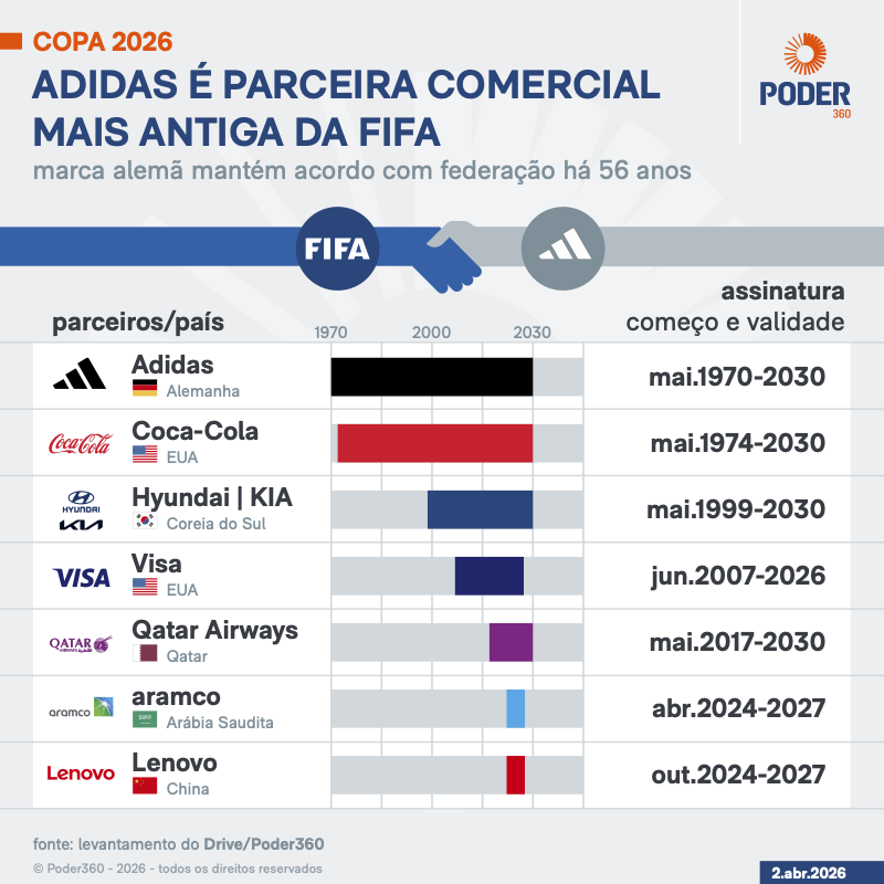 A Adidas é a parceira comercial mais antiga da Fifa (Federação Internacional de Futebol). O acordo entre as partes foi firmado em maio de 1970, passou por sucessivas renovações, e segue válido até o fim de 2030.