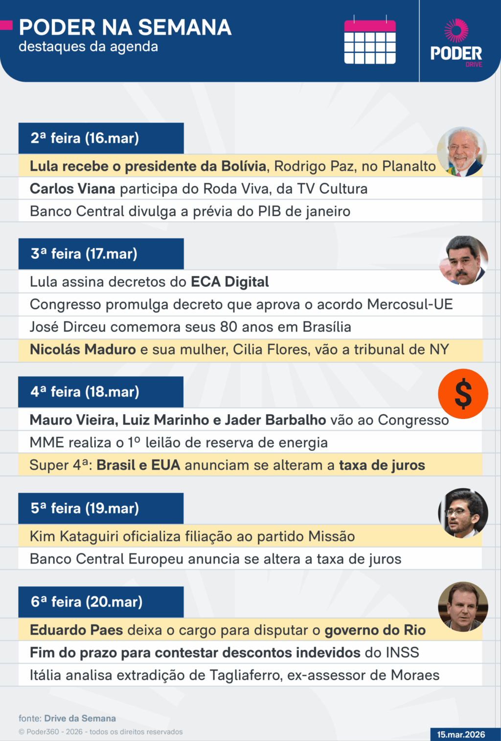 O jornal digital Poder360 traz nesta 2ª feira (16.mar.2026) uma seleção dos assuntos que devem ser destaque na agenda do poder e da política nesta semana, que vai até 20 de março.