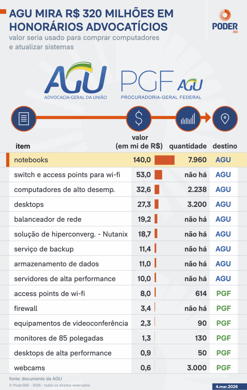 O volume previsto de equipamentos supera com folga o total de advogados públicos federais nas 4 carreiras da instituição: 5.521, segundo o Portal da Transparência.