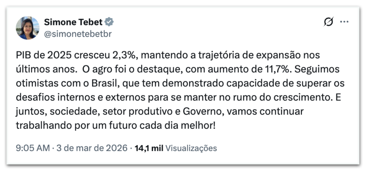 Em publicação nas redes sociais, a ministra declarou: “PIB de 2025 cresceu 2,3%, mantendo a trajetória de expansão nos últimos anos. O agro foi o destaque, com aumento de 11,7%”, escreveu.