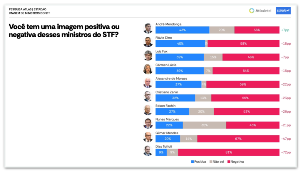 O estudo da AtlasIntel aferiu a percepção dos brasileiros sobre a imagem dos ministros. Os resultados mostram que 7 dos 10 atuais integrantes da Corte são mais rejeitados do que aprovados.