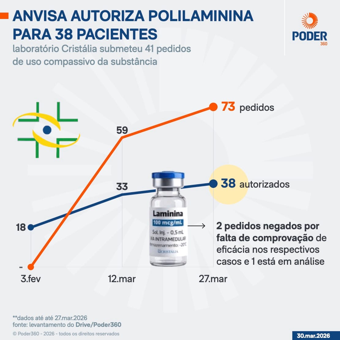 Subiu para 38 o número de pedidos aprovados pela Anvisa (Agência Nacional de Vigilância Sanitária) para o uso compassivo da polilaminina, segundo dados que marcam até 6ª feira (27.mar.2026), obtidos pelo Poder360 via LAI (Lei de acesso à Informação).