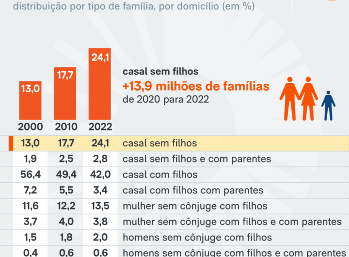 Proporção de famílias de casal sem filhos quase dobra em 22 anos 3 min read Geral Proporção de famílias de casal sem filhos quase dobra em 22 anos RealRadioTvBrasil novembro 5, 2025