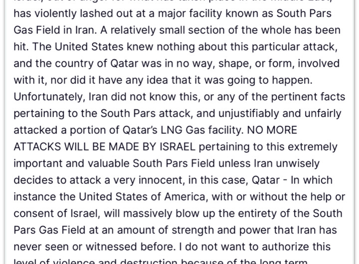 Trump ameaça explodir campo de gás em caso de retaliação do Irã 3 min read Geral Trump ameaça explodir campo de gás em caso de retaliação do Irã RealRadioTvBrasil março 19, 2026