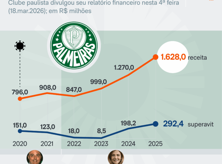 Palmeiras tem receita de R$ 1,6 bi em 2025 e superavit de R$ 292 mi 1 min read Geral Palmeiras tem receita de R$ 1,6 bi em 2025 e superavit de R$ 292 mi RealRadioTvBrasil março 18, 2026