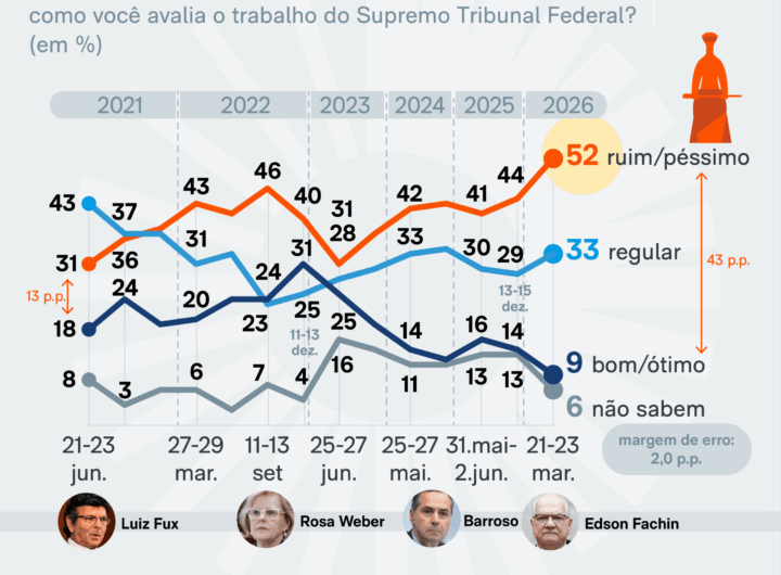 Com tensão entre Poderes, avaliação negativa do STF bate recorde 4 min read Geral Com tensão entre Poderes, avaliação negativa do STF bate recorde RealRadioTvBrasil março 27, 2026