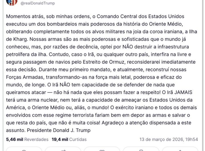 Trump diz ter bombardeado ilha que exporta 90% do petróleo do Irã 2 min read Geral Trump diz ter bombardeado ilha que exporta 90% do petróleo do Irã RealRadioTvBrasil março 13, 2026
