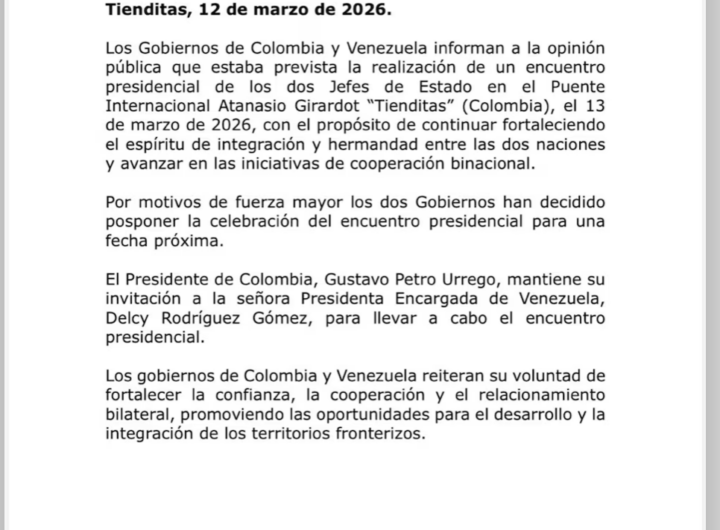 Venezuela e Colômbia cancelam reunião sem dar explicações 2 min read Geral Venezuela e Colômbia cancelam reunião sem dar explicações RealRadioTvBrasil março 13, 2026