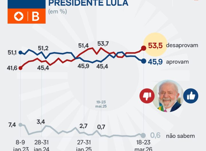 Lula é desaprovado por 53,5% e aprovado por 45,9%, diz AtlasIntel 2 min read Geral Lula é desaprovado por 53,5% e aprovado por 45,9%, diz AtlasIntel RealRadioTvBrasil março 25, 2026