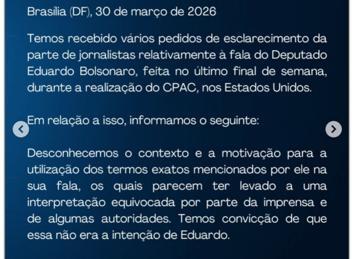 Michelle diz não ter recebido vídeo citado por Eduardo na CPAC 2 min read Geral Michelle diz não ter recebido vídeo citado por Eduardo na CPAC RealRadioTvBrasil março 30, 2026