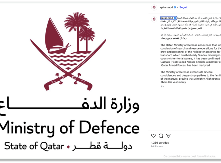 Helicóptero militar do Qatar cai durante exercício de rotina 1 min read Geral Helicóptero militar do Qatar cai durante exercício de rotina RealRadioTvBrasil março 22, 2026