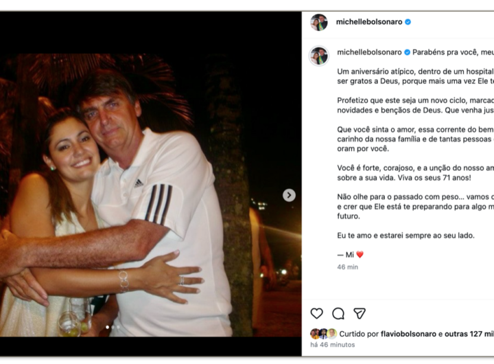 Michelle e filhos postam homenagens nos 71 anos de Bolsonaro 2 min read Geral Michelle e filhos postam homenagens nos 71 anos de Bolsonaro RealRadioTvBrasil março 21, 2026