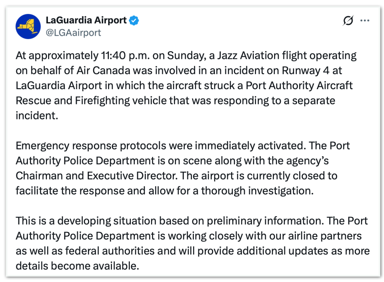 “Por volta das 23h40 [hora local] de domingo, um voo da Jazz Aviation, operando em nome da Air Canada, se envolveu em um incidente na pista 4 do Aeroporto LaGuardia, no qual a aeronave colidiu com um veículo de resgate e combate a incêndio da Autoridade Portuária que estava atendendo a outra ocorrência”, lê-se em publicação no perfil do LaGuardia no X.