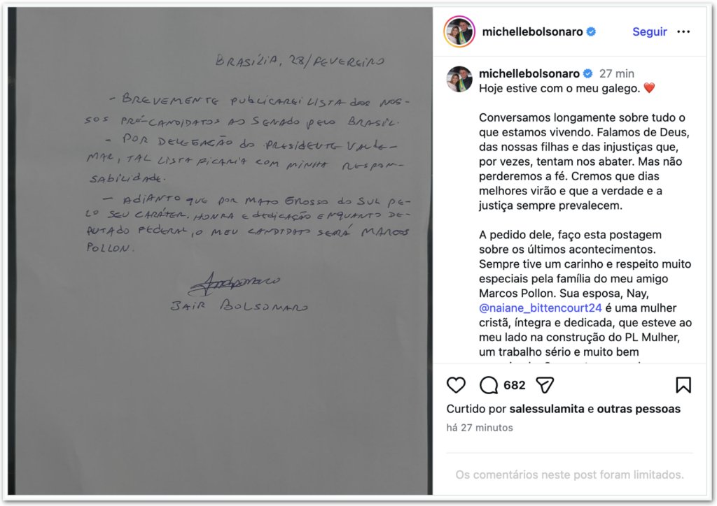 Na legenda da publicação, Michelle afirmou que fez a postagem “a pedido” de Bolsonaro. “Sempre tive um carinho e respeito muito especiais pela família do meu amigo Marcos Pollon. Sua esposa, Nay, é uma mulher cristã, íntegra e dedicada, que esteve ao meu lado na construção do PL Mulher, um trabalho sério e muito bem organizado. Sou grata por conhecer essa família de perto e testemunhar seus valores”, afirmou.