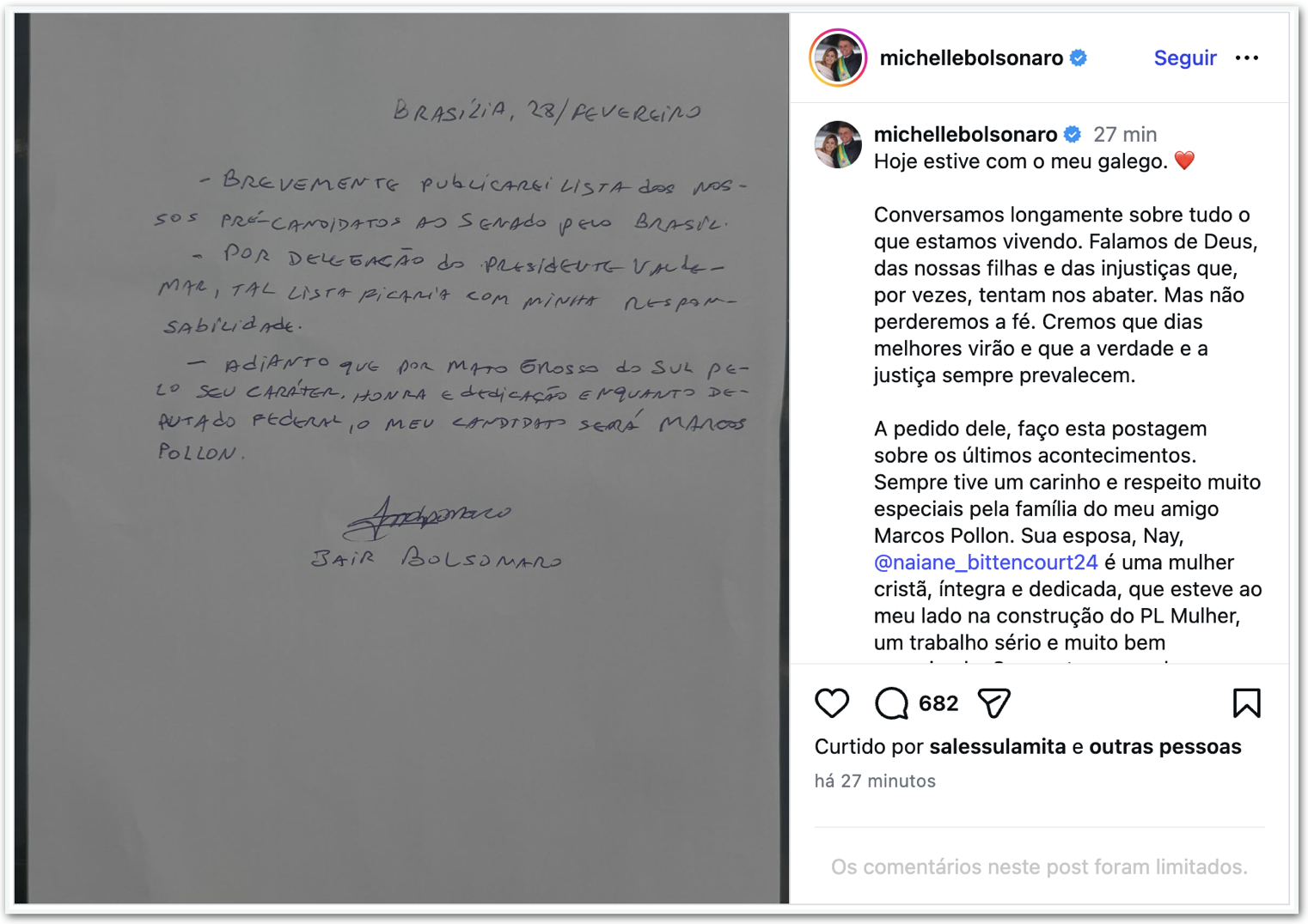 O ex-presidente Jair Bolsonaro (PL) declarou apoio ao deputado federal Marcos Pollon (PL-MS), pré-candidato ao Senado por Mato Grosso do Sul, e afirmou que “brevemente” publicará a lista dos outros nomes endossados pelo PL para a Casa Alta. A informação foi divulgada por meio de uma carta publicada nas redes sociais pela ex-primeira dama, Michelle Bolsonaro, no sábado (28.fev.2026).