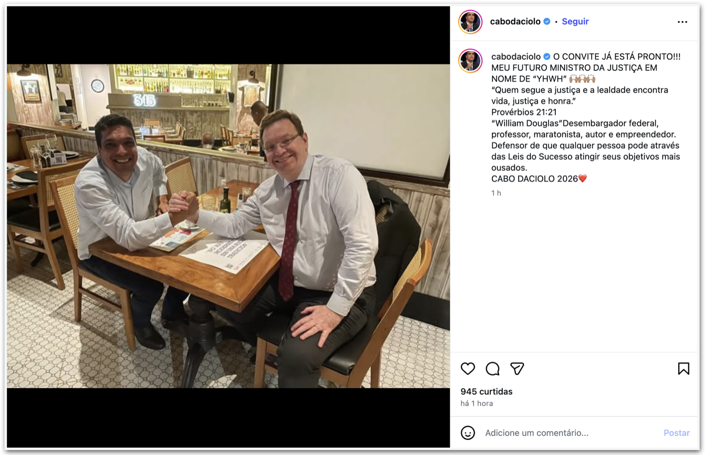 Nas redes sociais, Daciolo escreveu: “O convite já está pronto. Meu futuro ministro da Justiça em nome de ‘Yhwh’. Desembargador federal William Douglas. Professor, maratonista, autor e empreendedor. Defensor de que qualquer pessoa possa através das leis do sucesso atingir seus objetivos mais ousados”.