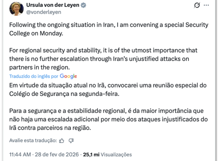 Vira meme post de von der Leyen sobre reunião para discutir Irã na 2ª feira 3 min read Geral Vira meme post de von der Leyen sobre reunião para discutir Irã na 2ª feira RealRadioTvBrasil março 1, 2026