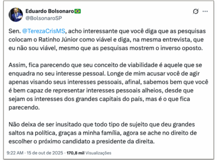 Eduardo diz que Tereza Cristina trabalha por “grandes capitais” 2 min read Geral Eduardo diz que Tereza Cristina trabalha por “grandes capitais” RealRadioTvBrasil outubro 15, 2025