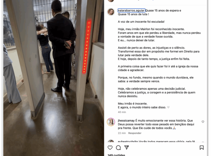 “A voz de um inocente foi escutada”, diz irmã de Mairlon após soltura 3 min read Geral “A voz de um inocente foi escutada”, diz irmã de Mairlon após soltura RealRadioTvBrasil outubro 15, 2025