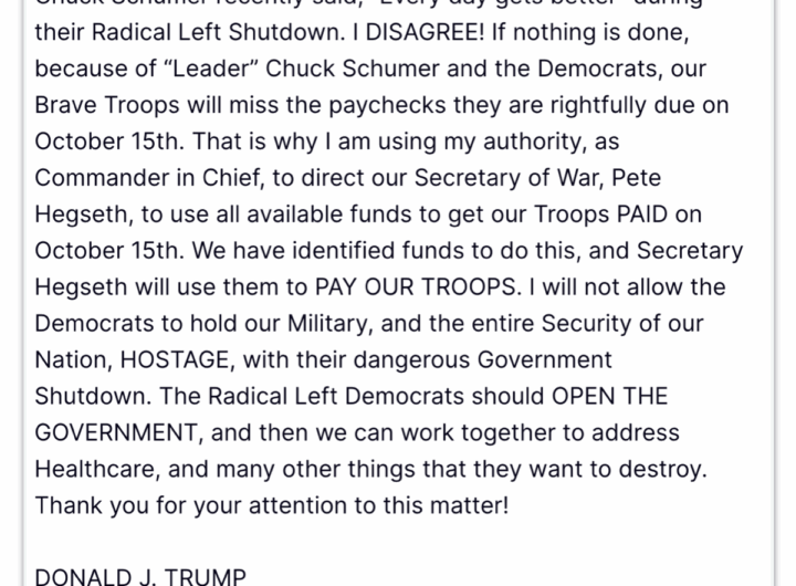 Trump diz que usará todos os recursos disponíveis para pagar militares 2 min read Geral Trump diz que usará todos os recursos disponíveis para pagar militares RealRadioTvBrasil outubro 11, 2025