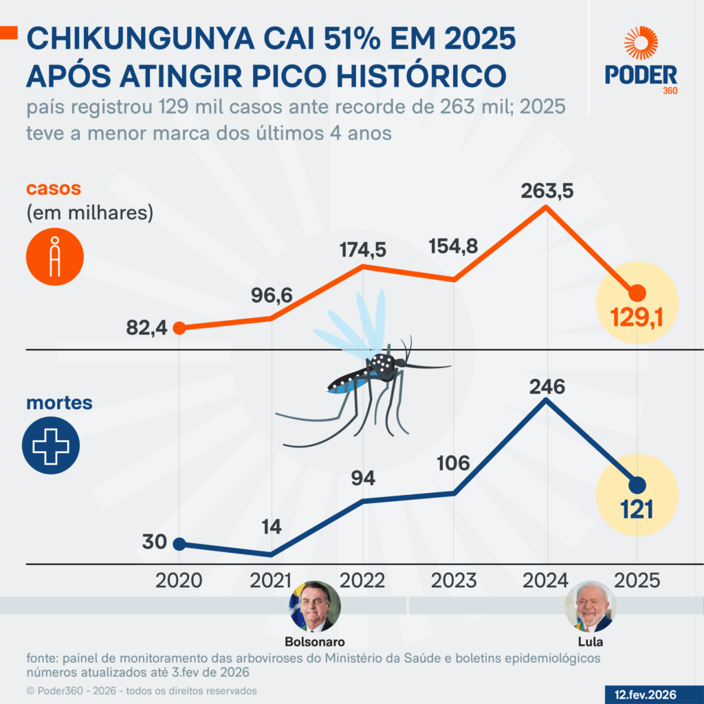 O número de casos de chikungunya no Brasil caiu 51% em 2025 em relação a 2024, quando o país passou por um pico da doença. No ano passado, foram 129.095 registros. Apesar da queda observada, o número de infectados ainda supera os registros do início da série de 6 anos (2020-2025).
