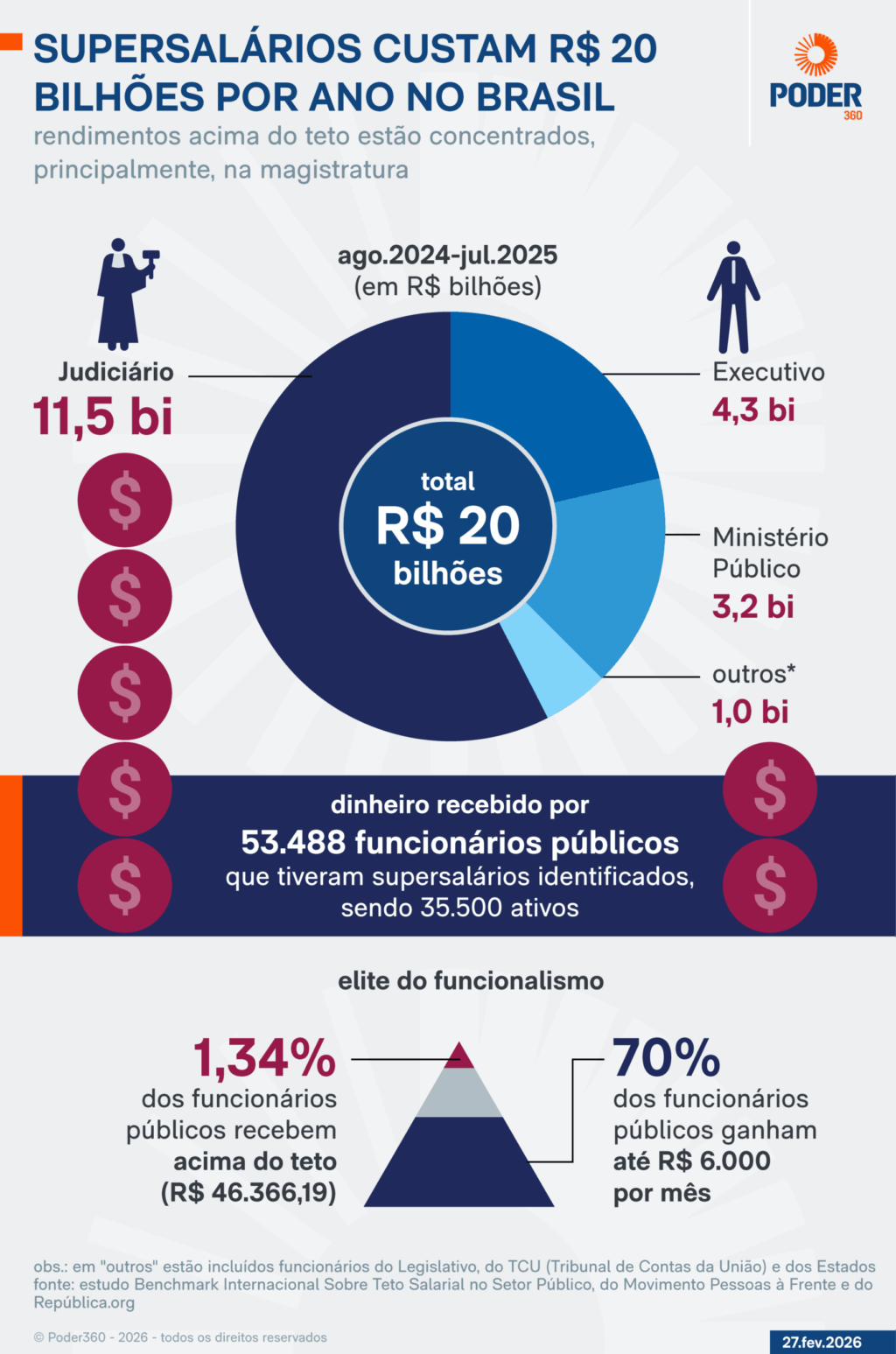 O estudo “Benchmark internacional sobre teto salarial no setor público”, da República.org e do Movimento Pessoas à Frente (íntegra – 8 MB – PDF), com dados compilados de agosto de 2024 a julho de 2025, indica que as carreiras do Judiciário e do Ministério Público receberam R$ 14,7 bilhões em pagamentos acima do teto no período de 1 ano.