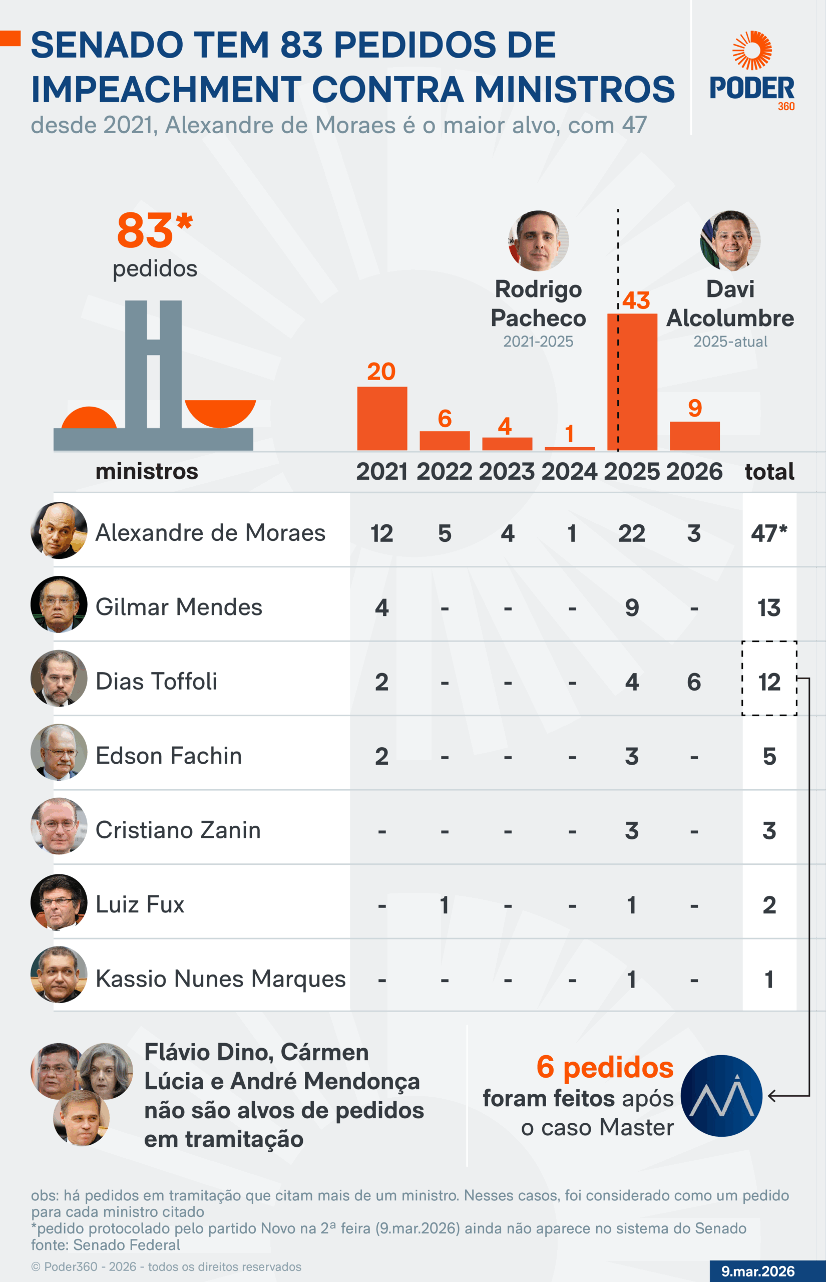 Com o pedido protocolado pelo governador de Minas Gerais, Romeu Zema (Novo) nesta 2ª feira (9.mar.2026), o ministro Alexandre de Moraes, do STF (Supremo Tribunal Federal), acumula 47 pedidos de impeachment no Senado desde 2021. Os integrantes da Corte foram alvos de 83 pedidos no período.