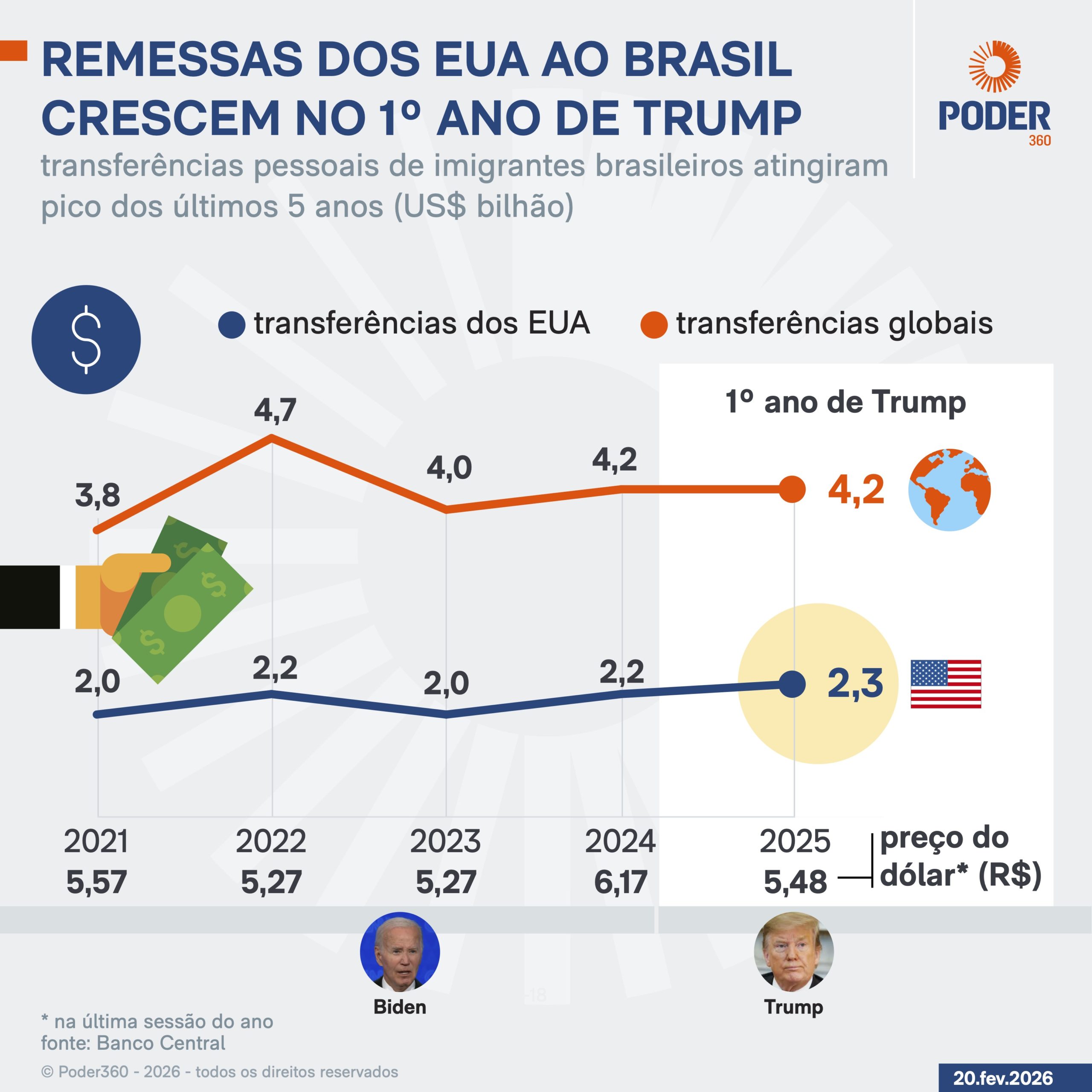 No 1º ano de retorno de Donald Trump ao governo, as remessas dos Estados Unidos ao Brasil cresceram apesar da queda de 11,18% do dólar na contramão do padrão histórico e do fluxo global. As remessas totais somaram US$ 4.227 bilhões em 2025 –recuo de 0,45% ante o ano anterior.