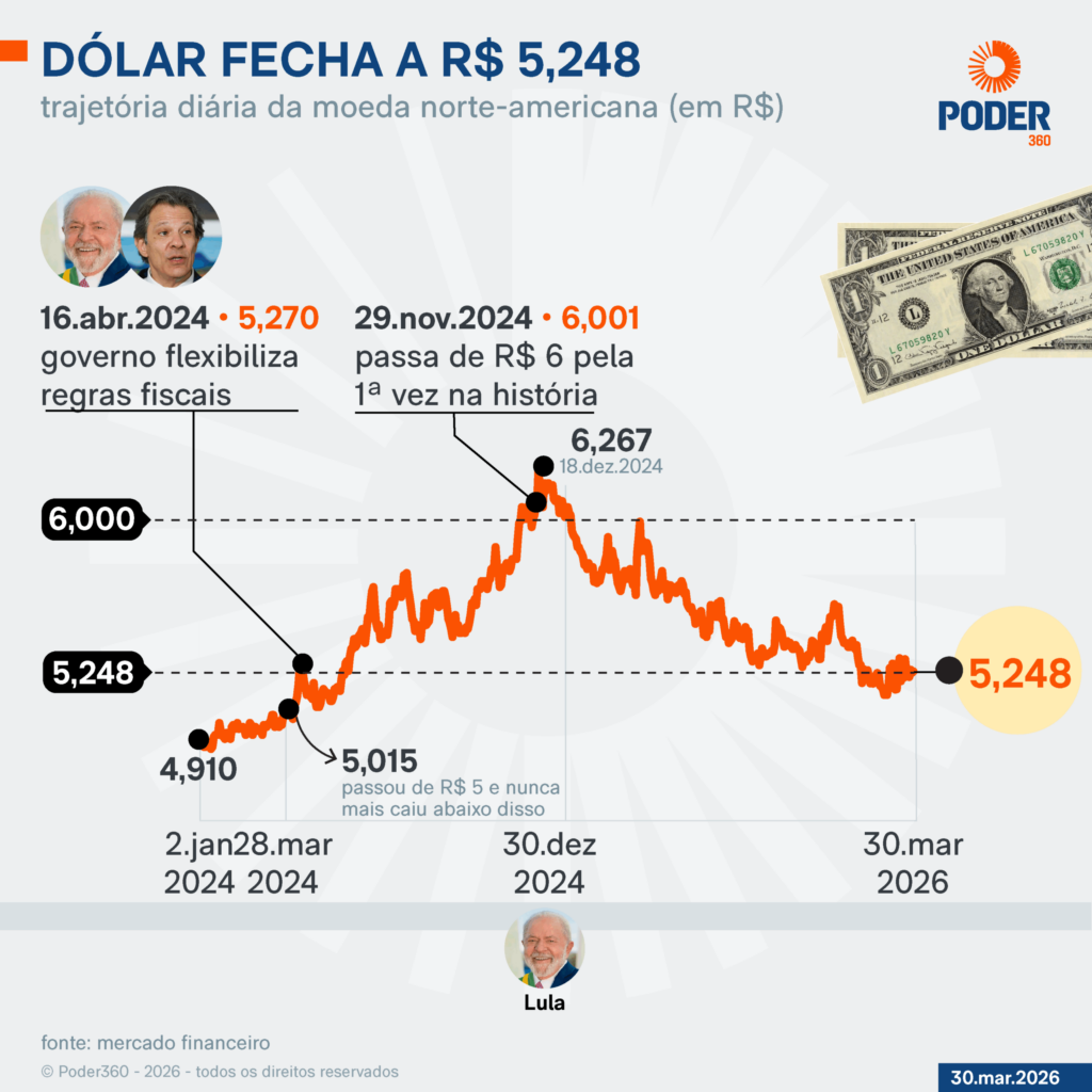 O dólar comercial fechou aos R$ 5,248, com alta de 0,12% nesta 2ª feira (30.mar.2026). A moeda norte-americana atingiu R$ 5,224 na mínima e R$ 5,267 na máxima. O Ibovespa, principal índice da B3 (Bolsa de Valores de São Paulo), encerrou o dia com alta de 0,53%, aos 182.514 pontos. Os agentes financeiros globais reagem à escalada de guerra no Oriente Médio.
