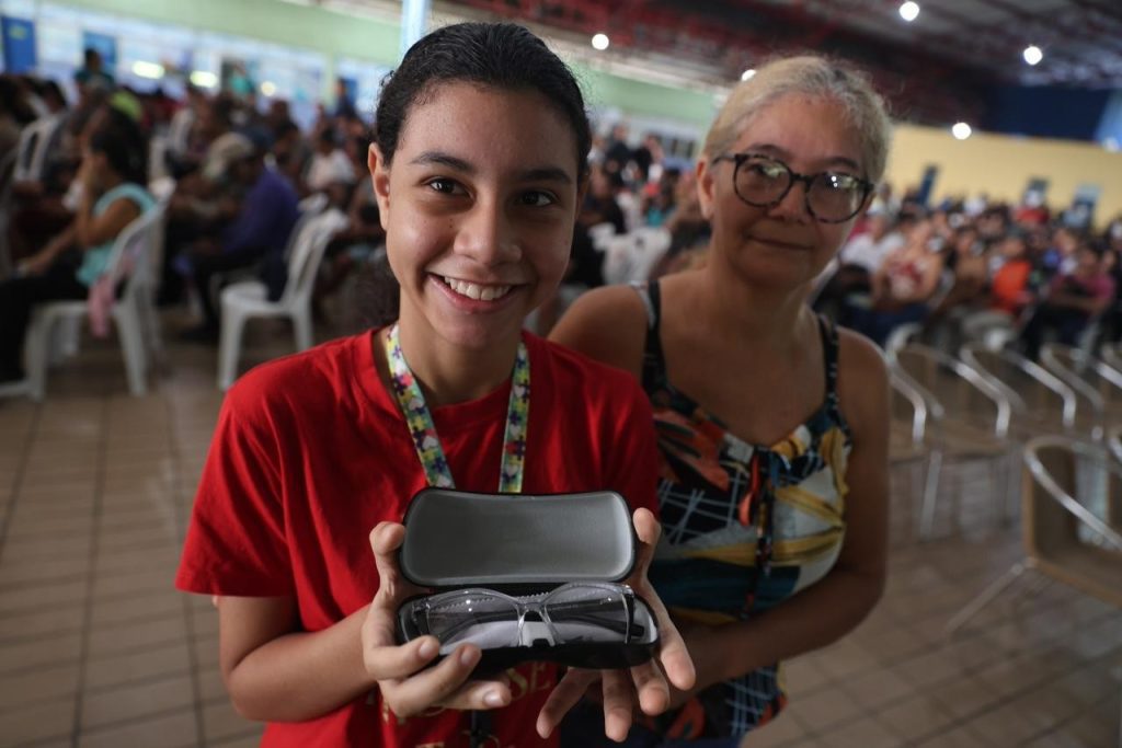 Ao lado de outros pacientes da rede estadual, ela recebeu um dos 1.234 óculos entregues no mutirão oftalmológico que já soma mais de 8,2 mil óculos distribuídos desde novembro de 2025. O evento foi acompanhado pelo governador interino, Roberto Cidade.