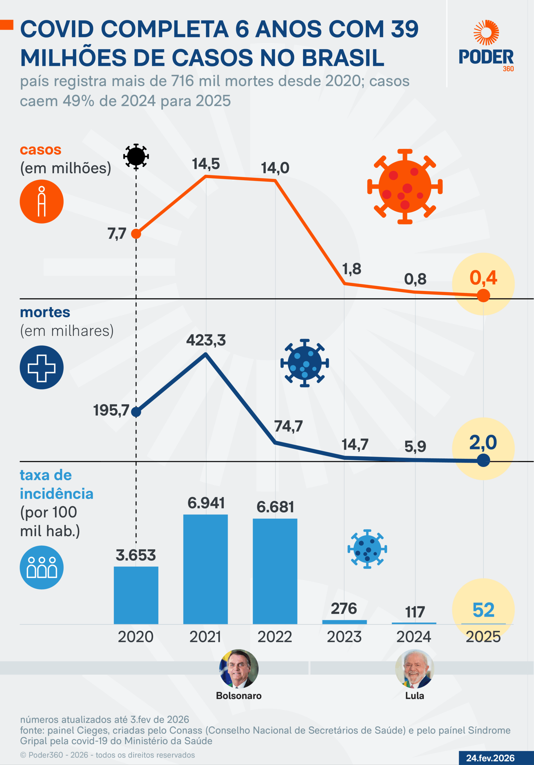 Exatos 6 anos após o 1º diagnóstico oficial da covid no país, em 26 de fevereiro de 2020, o Brasil já registrou 39.318.227 casos da doença –o que não significa que quase 40 milhões contraíram o novo coronavírus, uma vez que uma mesma pessoa pode ter se infectado mais de uma vez. No período de 2020 a 2025, foram registradas 716.626 mortes.