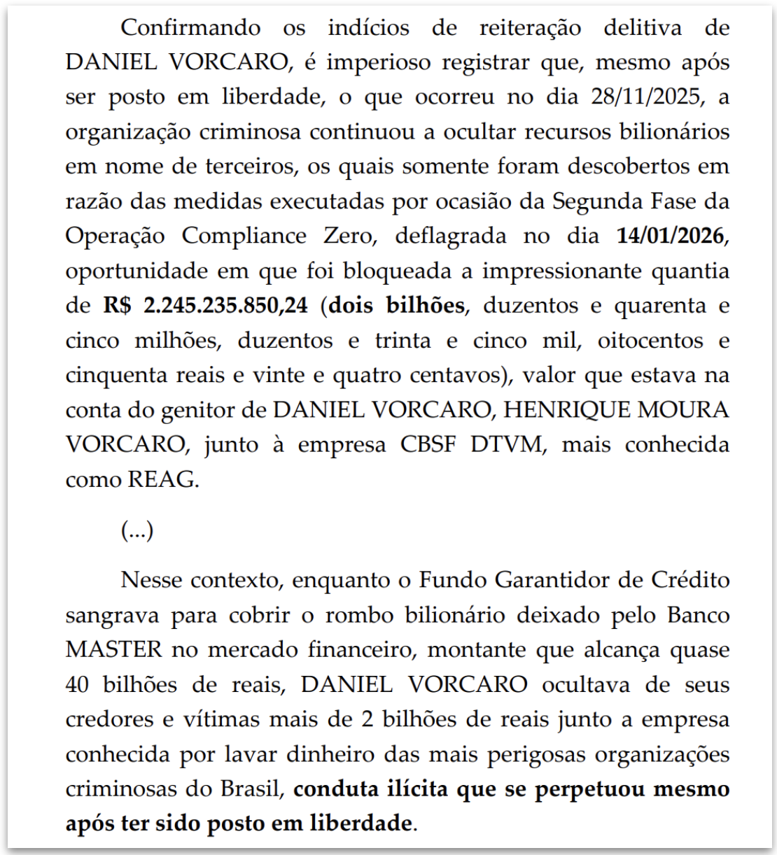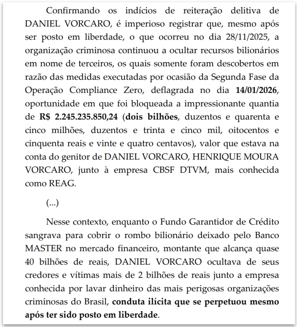 A PF (Polícia Federal) afirmou que o banqueiro Daniel Vorcaro, dono do Banco Master, ocultou mais de R$ 2,2 bilhões em uma conta bancária em nome do pai, Henrique Moura Vorcaro. A ocultação teria sido feita mesmo depois da soltura do banqueiro em novembro de 2025. A PF prendeu preventivamente o banqueiro na 4ª feira (4.mar.2026) por ordem do STF (Supremo Tribunal Federal). Eis a íntegra (PDF – 384 kB).