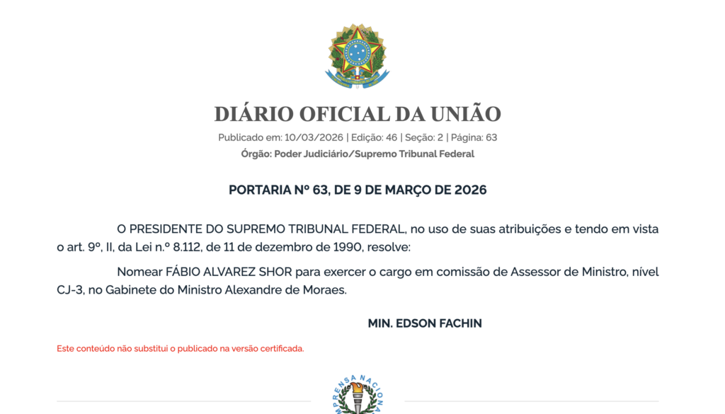 Shor conduziu o inquérito sobre a trama golpista, que embasou a denúncia da PGR (Procuradoria Geral da República) e, mais tarde, a condenação de Bolsonaro a 27 anos de prisão. A nomeação foi oficializada pelo presidente do STF, ministro Edson Fachin, nesta 3ª feira (10.mar), no DOU (Diário Oficial da União).