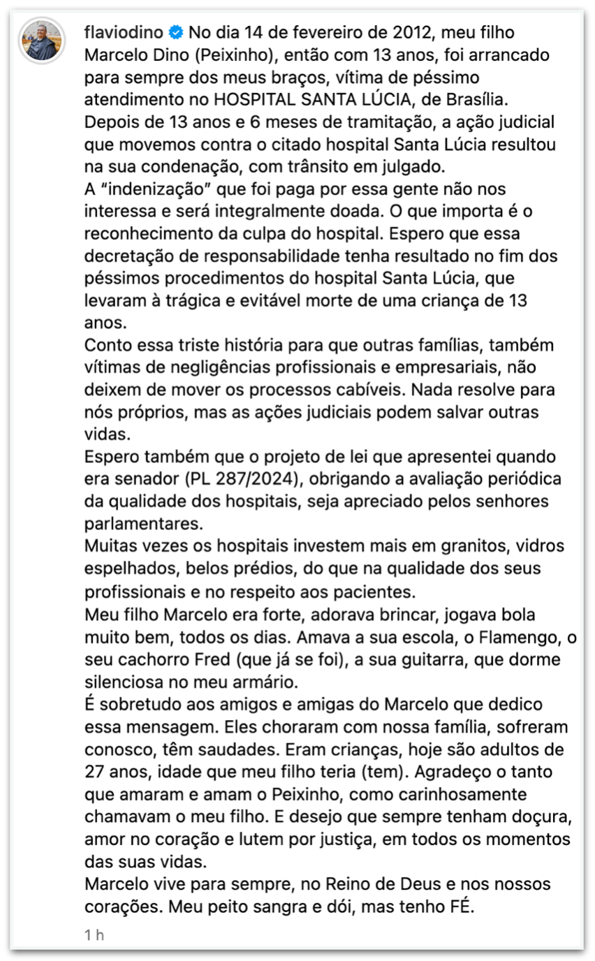 Em seu perfil no Instagram, Dino afirmou que “o que importa é o reconhecimento da culpa do hospital” e que espera “o fim dos péssimos procedimentos do hospital Santa Lúcia, que levaram à trágica e evitável morte de uma criança de 13 anos”.
