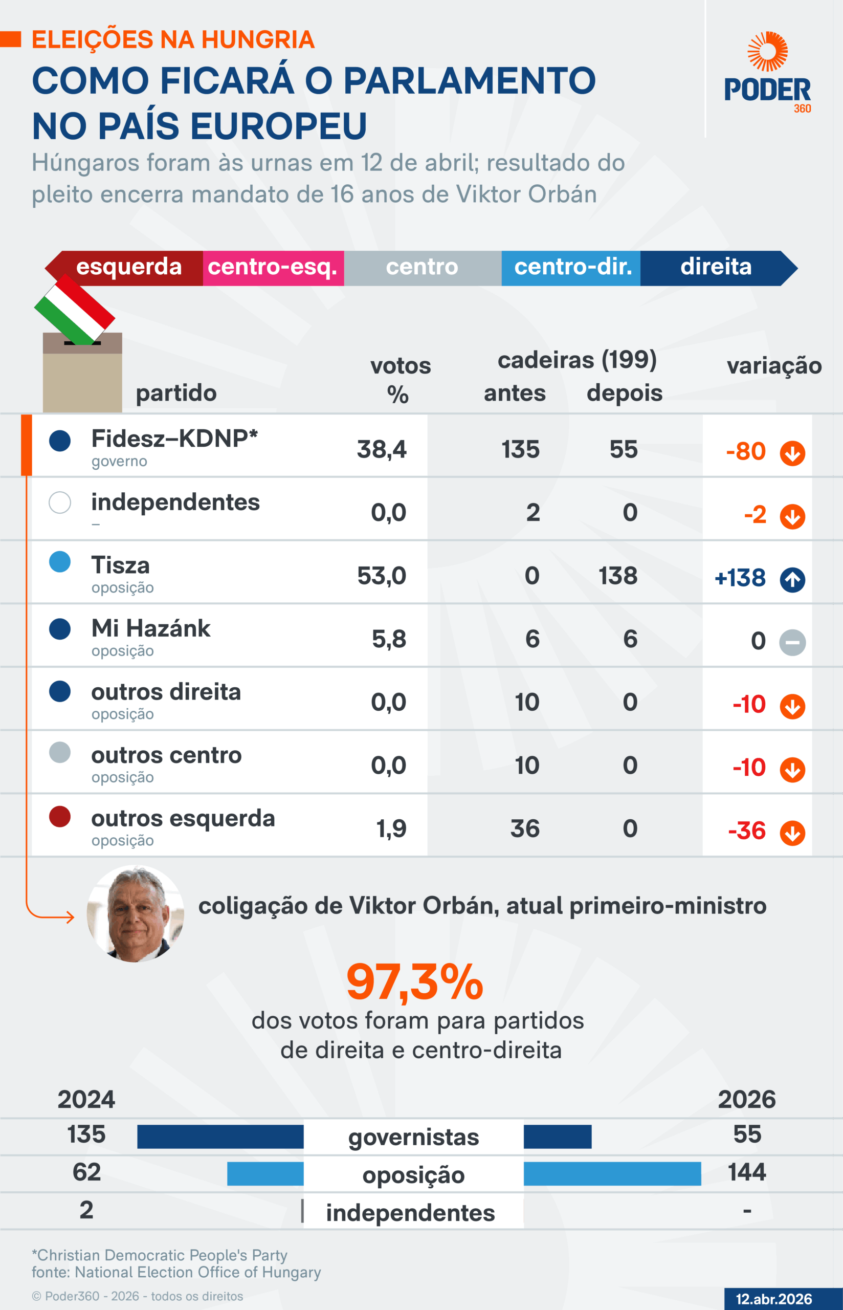 As forças de direita e centro-direita conquistaram 97,32% dos votos na Hungria nas eleições parlamentares realizadas neste domingo (12.abr.2026), com 98,93% das urnas apuradas. O resultado consolida uma hegemonia no país, mas com uma troca importante de comando: o partido Tisza (centro-direita), liderado por , superou com folga o governista Fidesz (direita) em número de cadeiras, encerrando um ciclo de 16 anos de no poder.